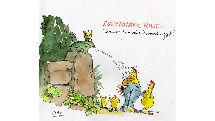 Peter Gaymann: Von den Freizeitparks , die ich kenne ist der Europa-Park die Nummer 1 plus mit Sternchen. Ich selbst habe mir noch nie so viel aus Achterbahnfahrten oder Wasserrutschen gemacht, aber der Europa-Park ist ja viel mehr: Tagungsort, Flaniermeile, tolle Hotels, die picobello geführt sind. Jeder Mensch, groß, klein, alt, jung wird hier irgendetwas oder mehr finden, was Ihm Spass macht, was genau auf Ihn zugeschnitten ist. Ich habe im Park runde Geburtstage mit Freunden gefeiert, Tagungen mit dem Bundesverband der Kinderhospize gemacht, Galadiners genossen, mit meinen Kindern und Enkeln Spass gehabt. Ich bewundere wirklich, mit welcher Sorgfalt und Leidenschaft jedes Detail in diesem Park behandelt wird. Ich habe selten Leute mit schlechter Laune im Park gesehen, es sei denn Sie hatten zu großen Hunger und mussten irgendwo Schlange stehen. Der Park wird dann im Winter noch mehr erstrahlen, wenn dort unter dem Motto „Da lachen ja die Hühner" meine Ausstellung eröffnet wird. Hihi.