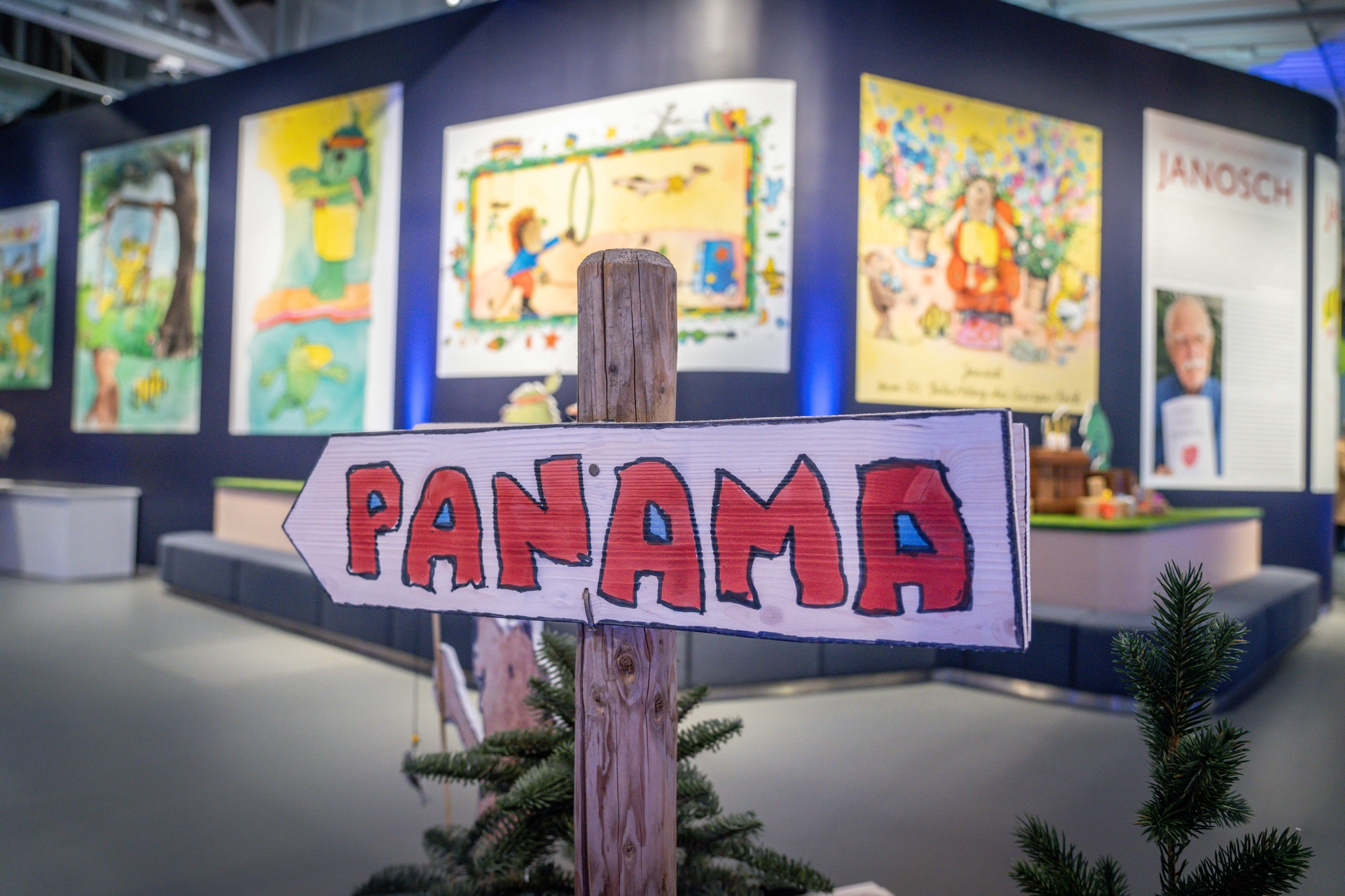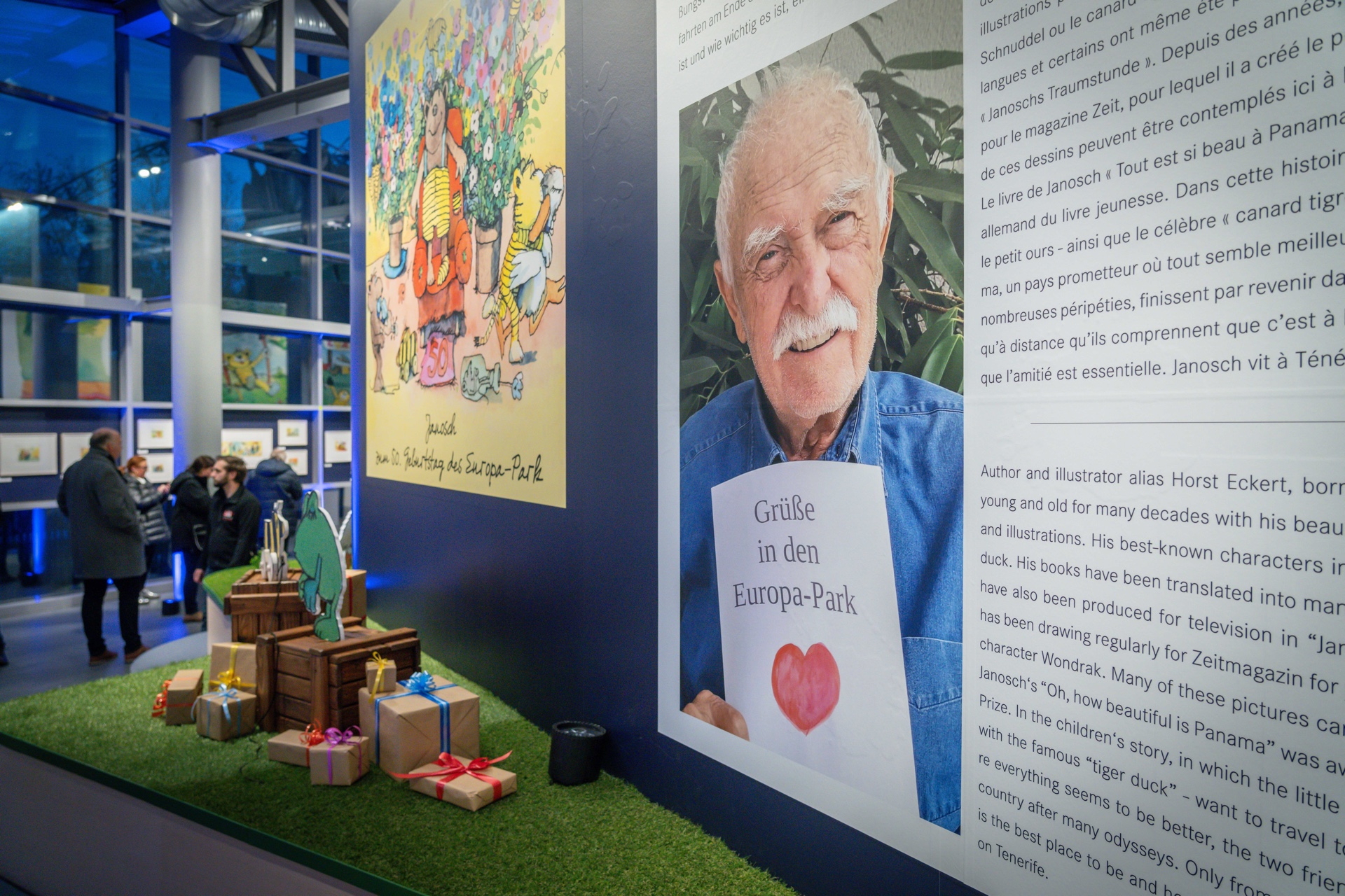 Familie Mack mit dem Freund und Verleger von Janosch Alexander Lieventhal (in der Mitte) in der Ausstellung im Europa-Park