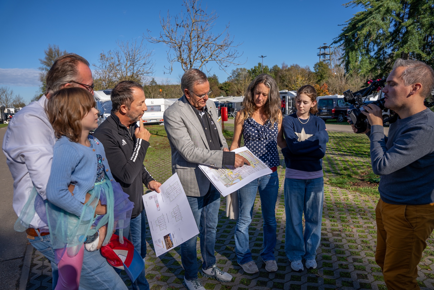 V.l.n.r.: Jürgen Mack, Roland Mack, Miriam Mack, Kai-Achim Klare, Wolfgang Kons, Pascal Weber bei der Grundsteinlegung