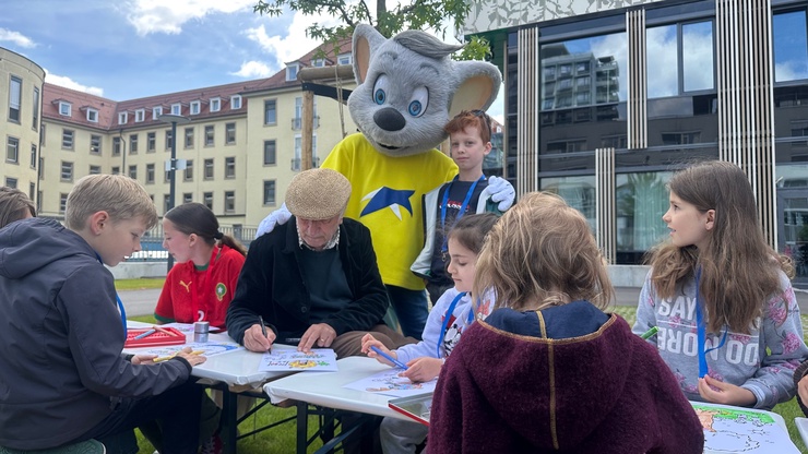 Großer Andrang bei der Malaktion mit Peter Gaymann: Der Vorplatz der Kinder- und Jugendklinik des Universitätsklinikums Freiburg verwandelte sich in ein buntes Künstler-Atelier: Der Freiburger Cartoonist Peter Gaymann malte gemeinsam mit jungen Patienten sowie Kindern von Mitarbeiterinnen und Mitarbeitern des Universitätsklinikums kreative Motive mit Buntstiften. Die Aktion fand in Kooperation mit dem Europa-Park statt. Ziel war es, den Kindern auf Station ein besonderes Erlebnis abseits des Klinikalltags zu bieten.